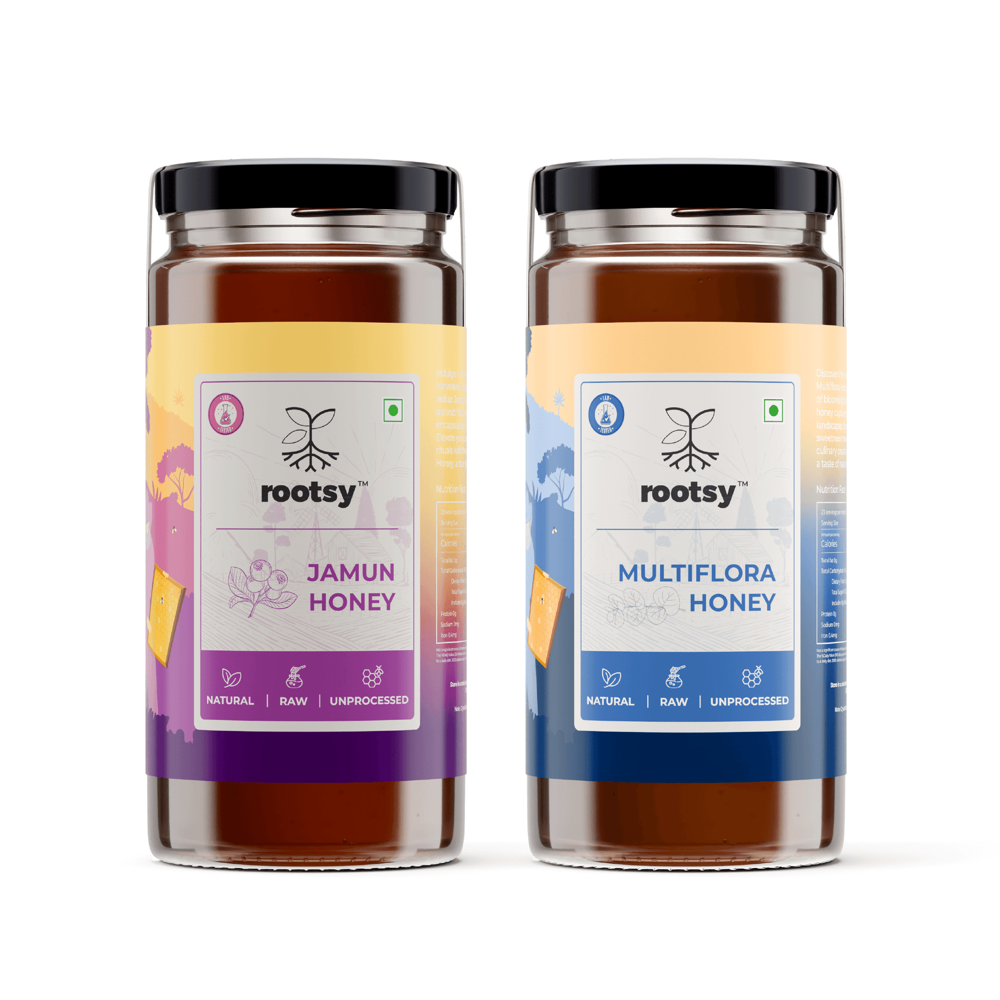 Discover the rich and diverse flavors of Rootsy Raw Multiflora Honey and Jamun Honey with this convenient pack of two 500g jars. Each honey is raw and unprocessed, harvested to preserve its natural health benefits and unique taste.